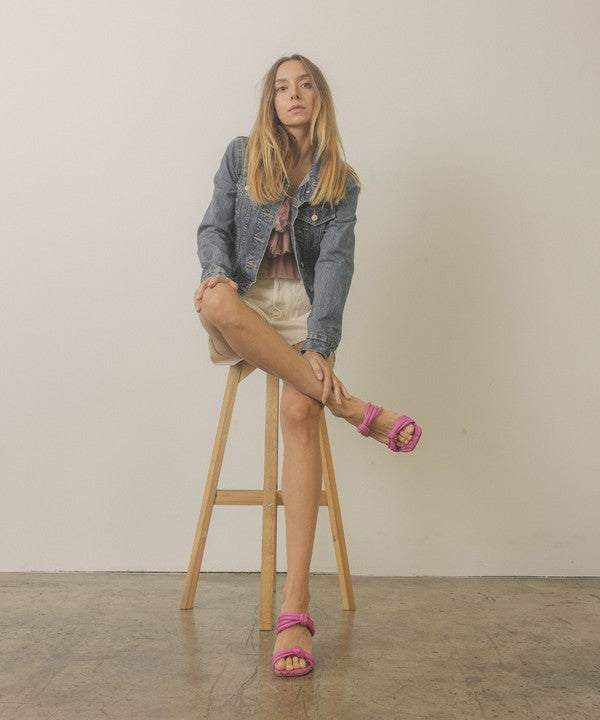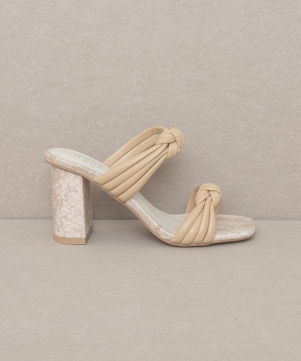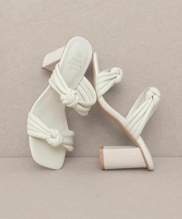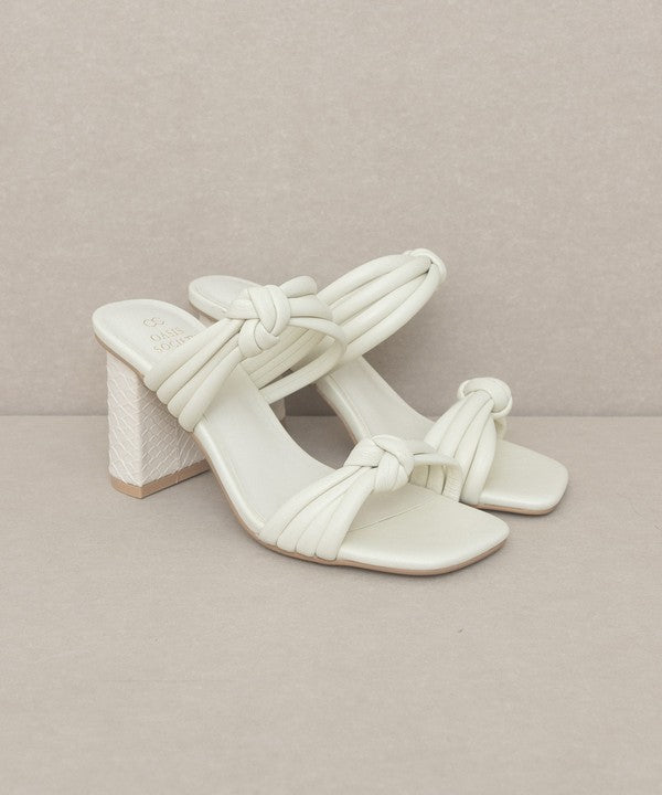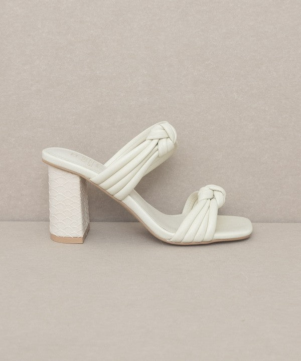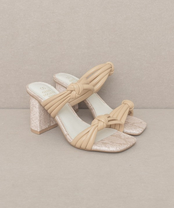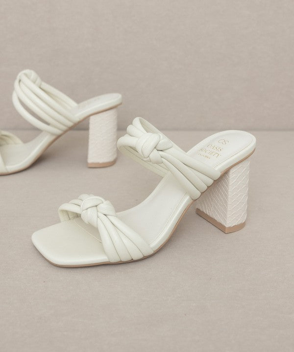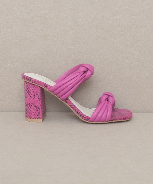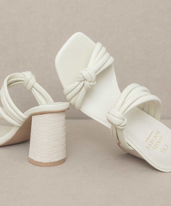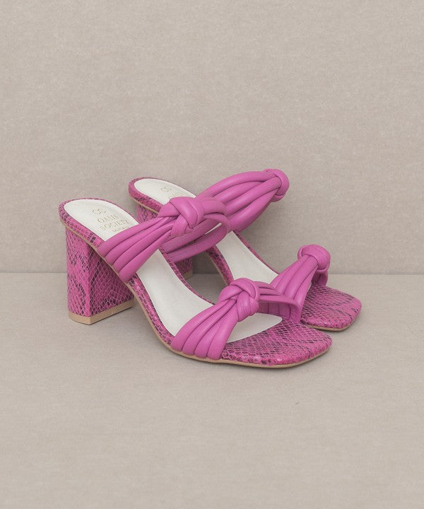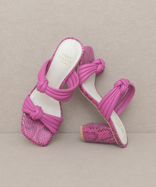 - The bubbly knotted straps on an architectural snake skin heel give this sandal the perfect balance.