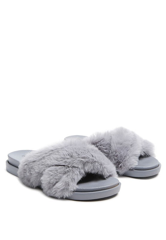 - Fur Strap slip-on flat with a soft comfortable insole that secures feet well and with gripping outsole.